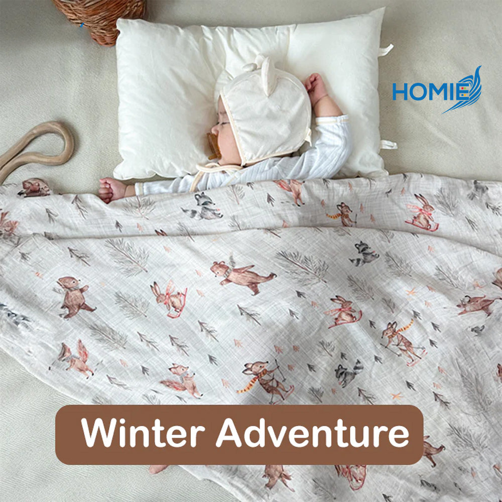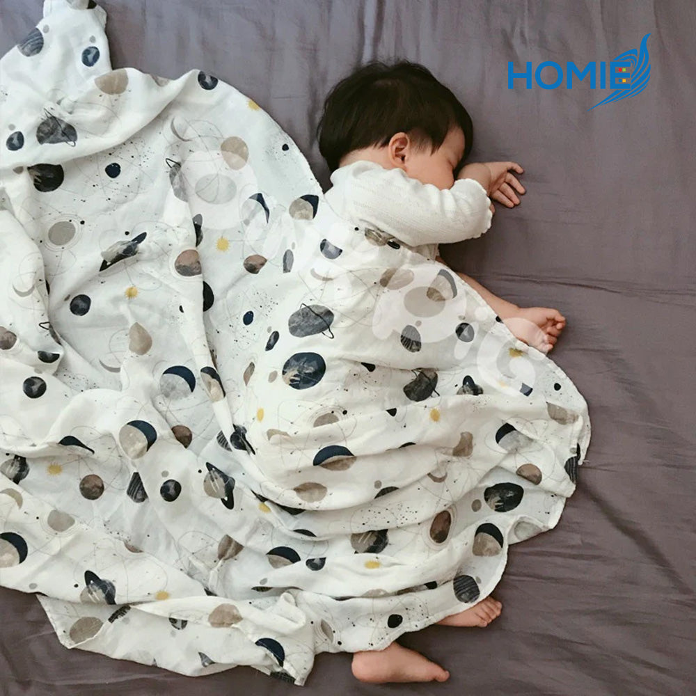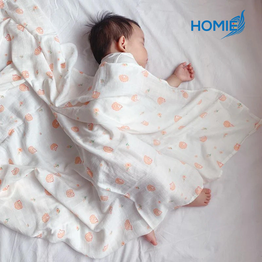 Our HOMIE Bamboo Muslin Swaddle Blanket is the perfect blend of luxury and functionality. Designed for a parent who values both style and comfort, this oversized swaddle provides a safe and cozy environment for your baby to dream peacefully.