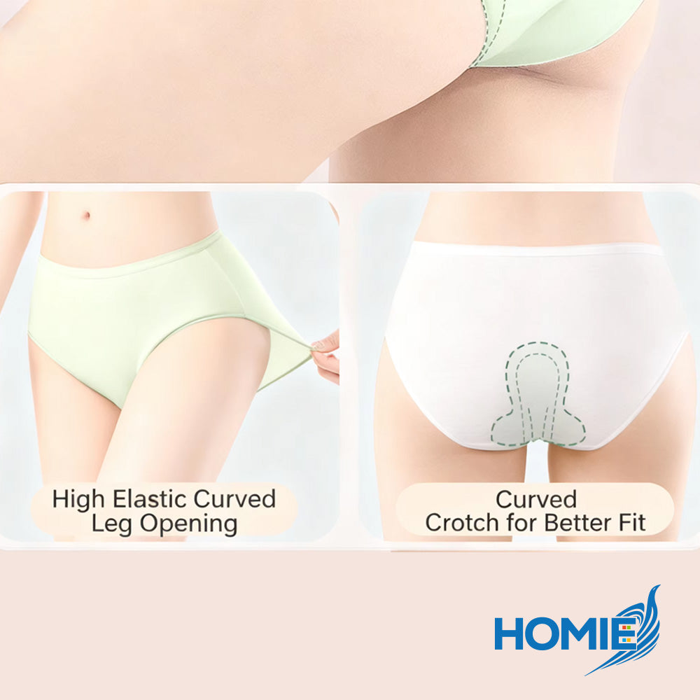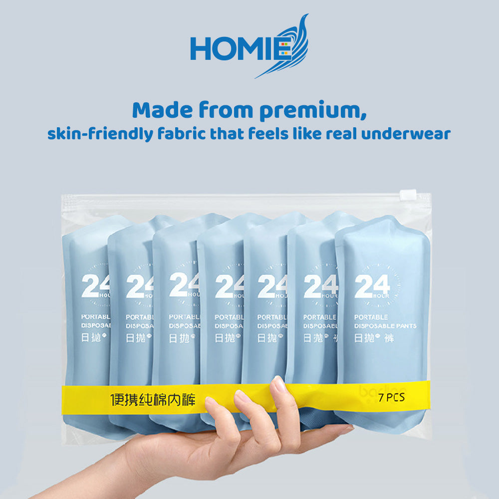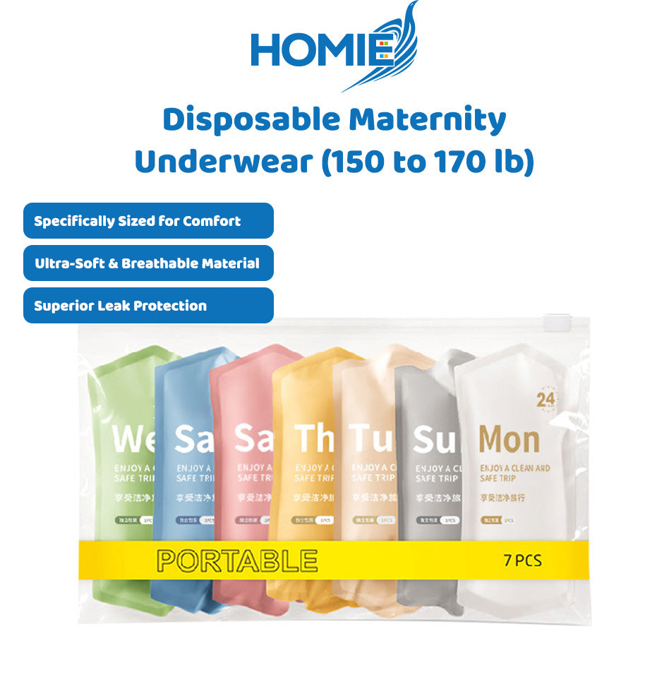 HOMIE Disposable Maternity Underwear Experience ultimate convenience and gentle comfort with the HOMIE Disposable Maternity Underwear (suitable for 150 to 170 lb). Perfect for hospital stays, postpartum recovery, travel, and everyday wear, these breathable, soft cotton-blend underwears provide maximum hygiene and support when you need it most. Each pack contains 7 pieces, conveniently separated by day of the week for easy packing! Prioritize your comfort—add to cart today!