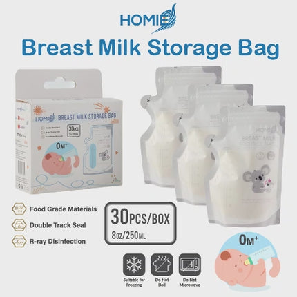 The HOMIE Breast Milk Storage Bag is designed for safe, hygienic, and convenient storage of expressed breast milk. Each bag holds up to 250ml (8oz) and comes pre-sterilized with R-ray disinfection β¨ for maximum hygiene. Made from BPA-free material and secured with a double track seal π, it is 100% leak-proof and safe for your little one. With a strong seal, clear measurement markings, and an easy-pour spout, storing and feeding becomes simple and stress-free.
