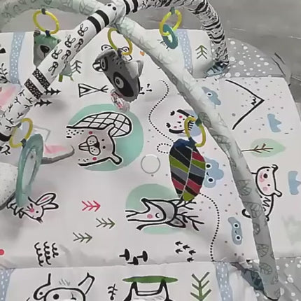 🧸 Interactive Play Gym Design – Features hanging toys to stimulate sight, touch, and hearing — perfect for early exploration.